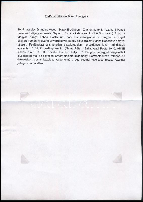 Zilah 1945 1P felülnyomott díjjegyes levelezőlap Zilah II. 2P kiegészítéssel ajánlott küldeményként feladva. A levelezőlap példányszáma ismeretlen, a szakirodalom egy másik futott példányt említ egyedül. Ajánlott küldeményből jelenleg ez az egy darab ismert, a lap szerepel A magyar bélyegek katalógusa 2018/II. kötetében is. Óriási megszállási és díjjegyes ritkaság!