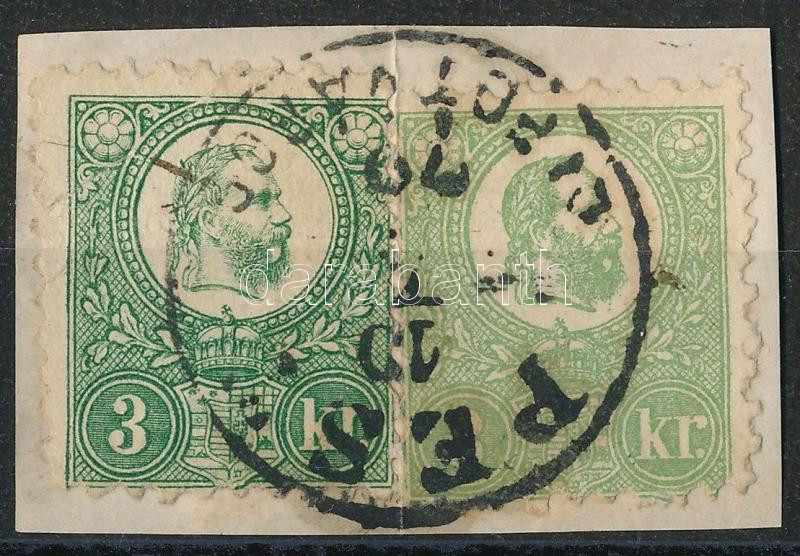 1871 Kőnyomat 3kr és Réznyomat 3kr vegyes bérmentesítés kivágáson. Mindkét bélyeg hibátlan. Rendkívül mutatós és ritka darab! / Mi 2 + 9 faultless stamps, mixed franking on cutting. Attractive and very rare piece! "PEST / LIPÓTVÁROS" Certificate: Visnyovszki
