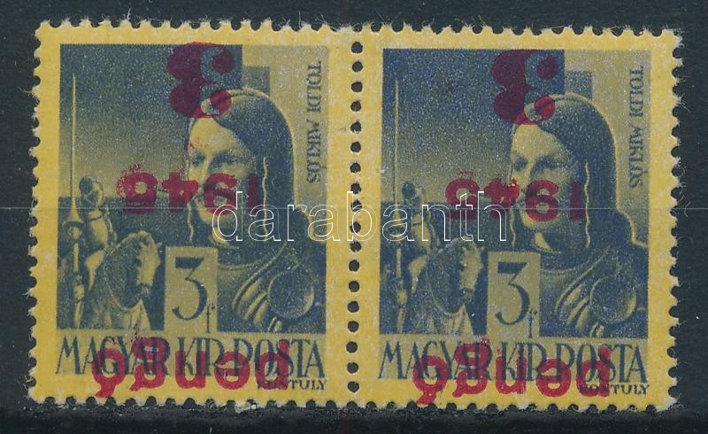 1945 Kisegítő IV. 3P/3f pár fordított és elcsúszott felülnyomattal, Leitold vizsgálójellel / Mi 805 pair with shifted and inverted overprint, sign: Leitold