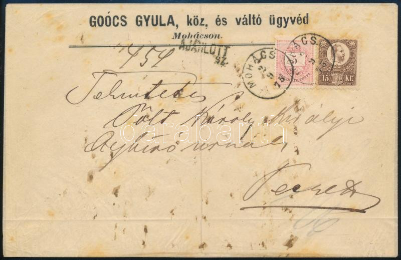 Beschreibung: 1875 Réznyomat 15kr sárgásbarna és Színesszámú 5kr vegyes bérmentesítés ajánlott levélen / Mi 12 yellowish brown + 17 mixed franking on registered cover "MOHÁCS" - Pécs