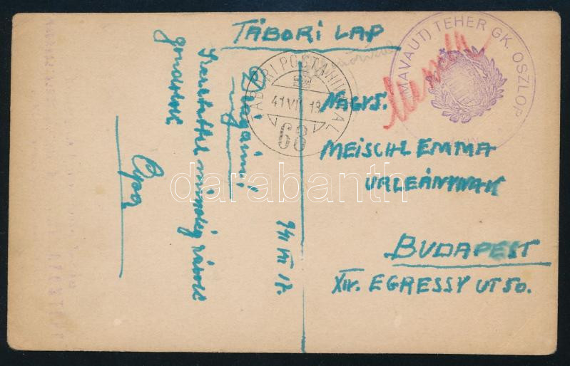 1941 Tábori posta képeslap "(MAVAUT) TEHER GK. OSZLOP" + "TP 68"