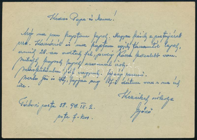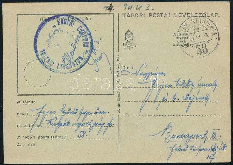 1941 Tábori posta levelezőlap / Field postcard "KÁRPÁT CSOPORT GAZDASÁGI HIVATAL"