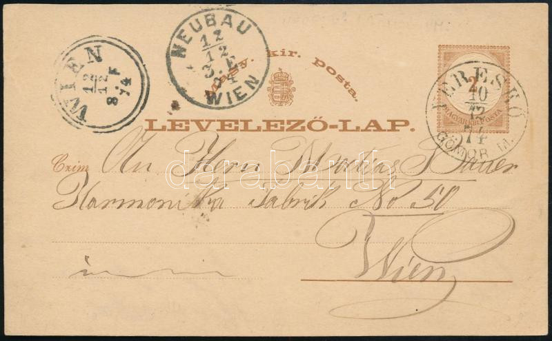 1874.12.10. Nagyon korai levelezőlap (II. vízjel) / Very early PS-card... https://www.darabanth.com/de/45-Gross-Auktion/45.1/Philatelie-und-Postgesichte-Ungarn-Online/Ausgaben-1874-1899~18742/18741210-Nagyon-korai-levelezolap-II-vizjel-Very-early-PS-card-VERESKO-GOMOR-M~II3449163