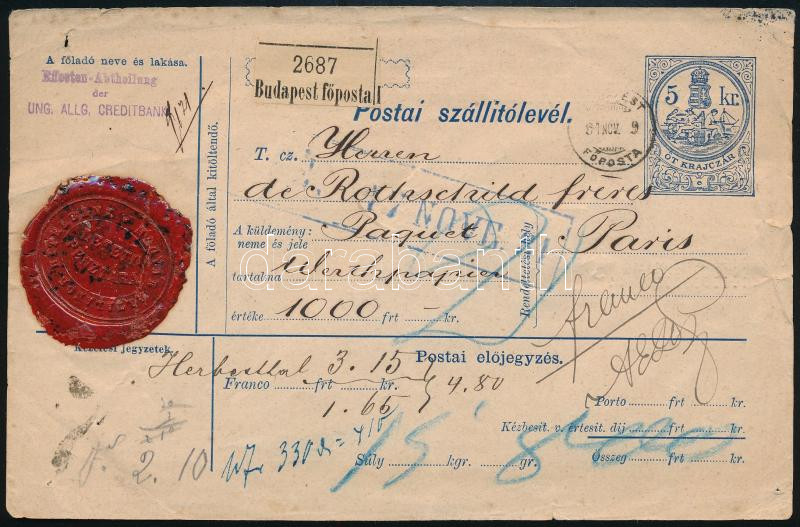 Beschreibung: 1881 Értékcsomag szállítólevél / Parcel card to Paris