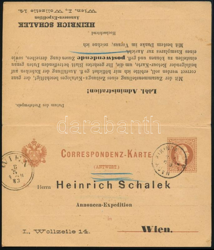 1883 Osztrák díjjegyes válaszos levelezőlap, oda-vissza futott, "... https://www.darabanth.com/de/45-Gross-Auktion/45.1/Philatelie-und-Postgesichte-Ungarn-Online/Ausgaben-1874-1899~18742/1883-Osztrak-dijjegyes-valaszos-levelezolap-oda-vissza-futott-WEISSGARBER-WIEN-NAGY-KIKI~II3448933