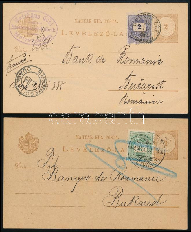 Beschreibung: 1885 2 db díjkiegészített díjjegyes levelezőlap / 2 PS-cards with additional franking