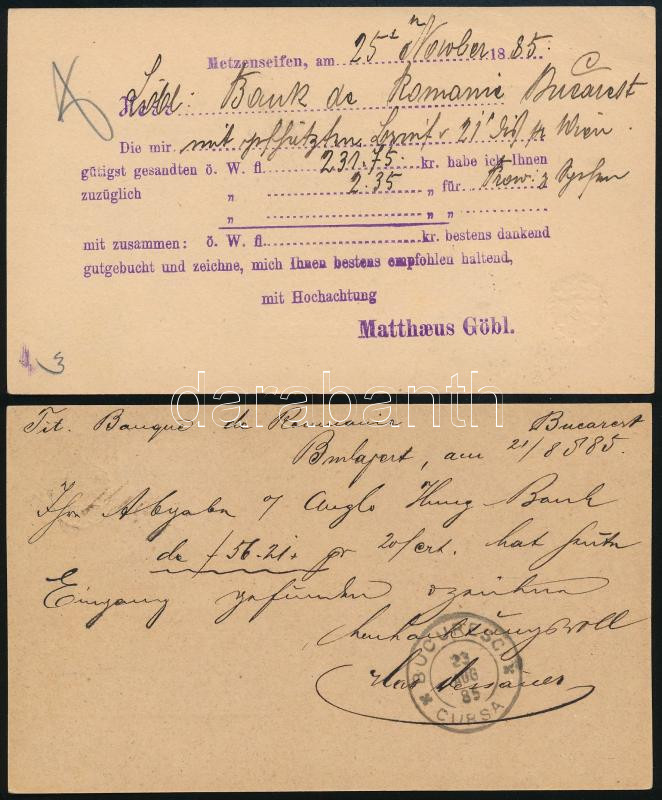 1885 2 db díjkiegészített díjjegyes levelezőlap / 2 PS-cards with addi... https://www.darabanth.com/de/45-Gross-Auktion/45.1/Philatelie-und-Postgesichte-Ungarn-Online/Ausgaben-1874-1899~18742/1885-2-db-dijkiegeszitett-dijjegyes-levelezolap-2-PS-cards-with-additional-franking~II3449271