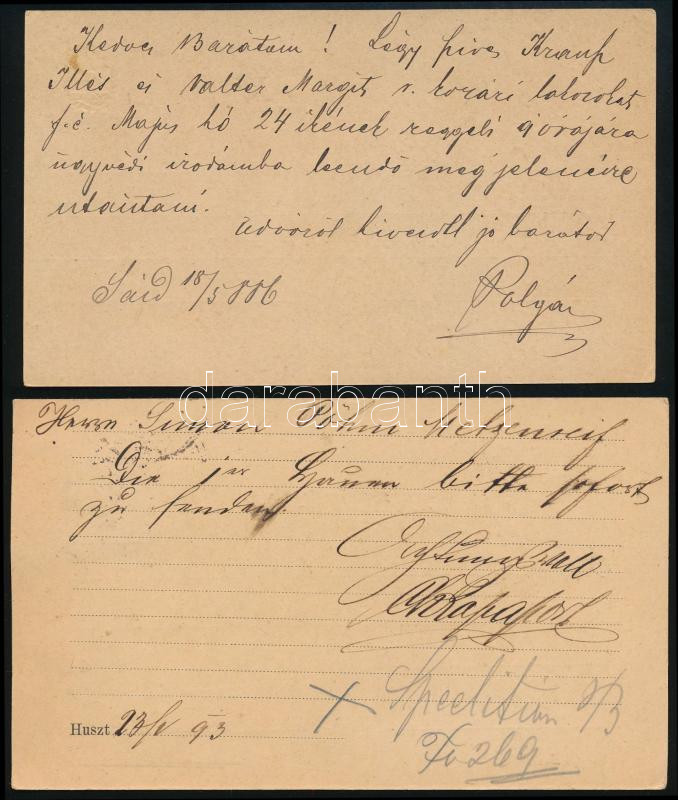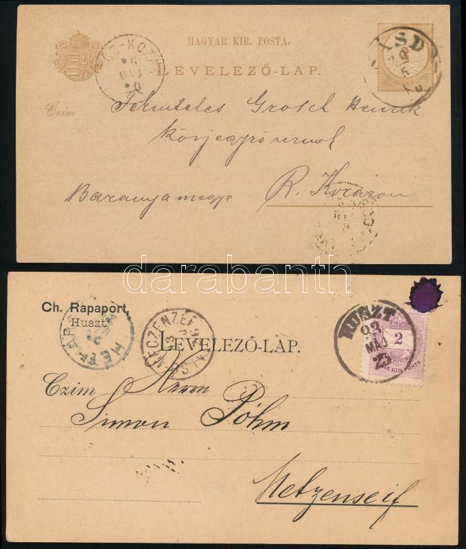 1886-1893 2 db levelezőlap "SÁSD", "HUSZT" https://www.darabanth.com/de/45-Gross-Auktion/45.1/Philatelie-und-Postgesichte-Ungarn-Online/Ausgaben-1874-1899~18742/1886-1893-2-db-levelezolap-SASD-HUSZT~II3449190