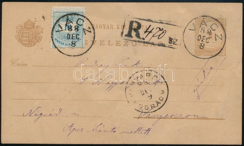 Beschreibung: 1888 2kr díjjegyes levelezőlap 10kr kiegészítéssel ajánlott küldeményként feladva / Registered 2kr PS-card with 10kr additional franking "VÁCZ" - "VANYARCZ / NOGRÁD M"