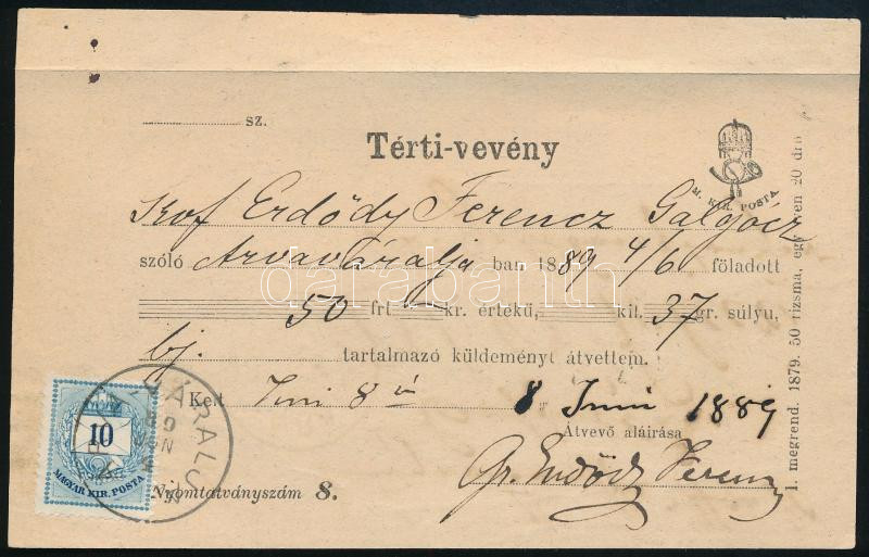 Beschreibung: 1889 10kr tértivevényen / on retour receipt "ÁRVA VÁRALJA"