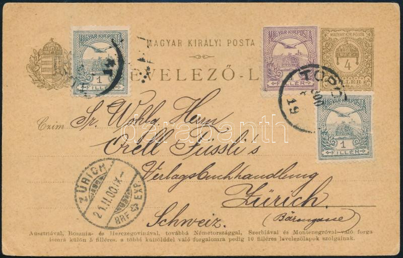 Beschreibung: 1900 4f díjjegyes levelezőlap 3 db Turul bélyeggel kiegészítve Svájcba "TOPO(LYA)" - "ZÜRICH"