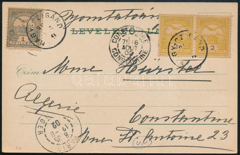 Beschreibung: 1902 Képeslap Turul 1f + 2 x 2f bérmentesítéssel Algériába küldve / Postcard to Algeria "NAGY-CZIGÁND" - "CONSTANTINE"