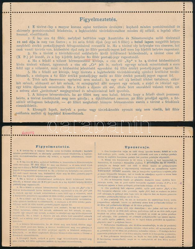 1904 2 klf táviratlap, az egyik futott, a másik magyar-horvát nyelvű /... https://www.darabanth.com/de/45-Gross-Auktion/45.1/Philatelie-und-Postgesichte-Ungarn-Online/Ausgaben-1900-1919~18744/1904-2-klf-taviratlap-az-egyik-futott-a-masik-magyar-horvat-nyelvu-2-different-PS-telegram-~II3445501