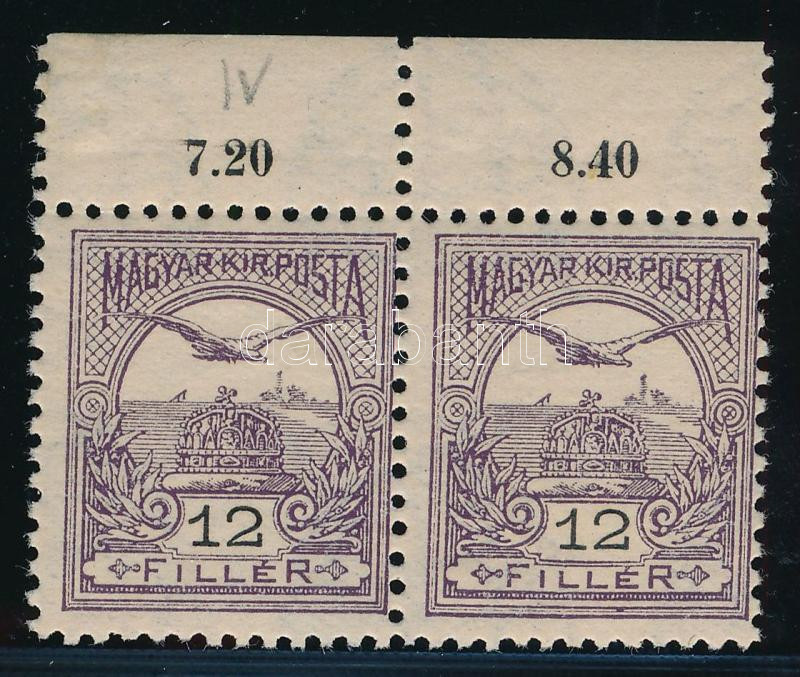 1904 Turul 12f ívszéli pár számvízjellel / number in the watermark https://www.darabanth.com/de/45-Gross-Auktion/45.1/Philatelie-und-Postgesichte-Ungarn-Online/Ausgaben-1900-1919~18744/1904-Turul-12f-ivszeli-par-szamvizjellel-number-in-the-watermark~II3447358