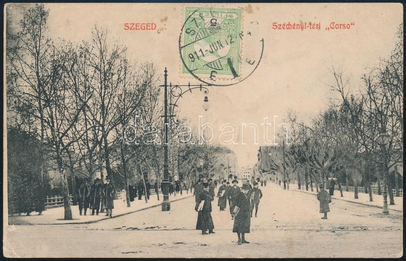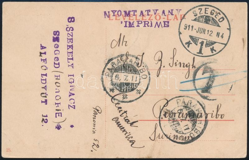 1911 TCV képeslap Turul 5f bélyeggel Holland Guyanába, Surinameba küldve, érvénytelenített T portóbélyegzéssel / TCV postcard from Hungary to Suriname, with invalid postage due postmark "SZEGED" - "PARAMARIBO"