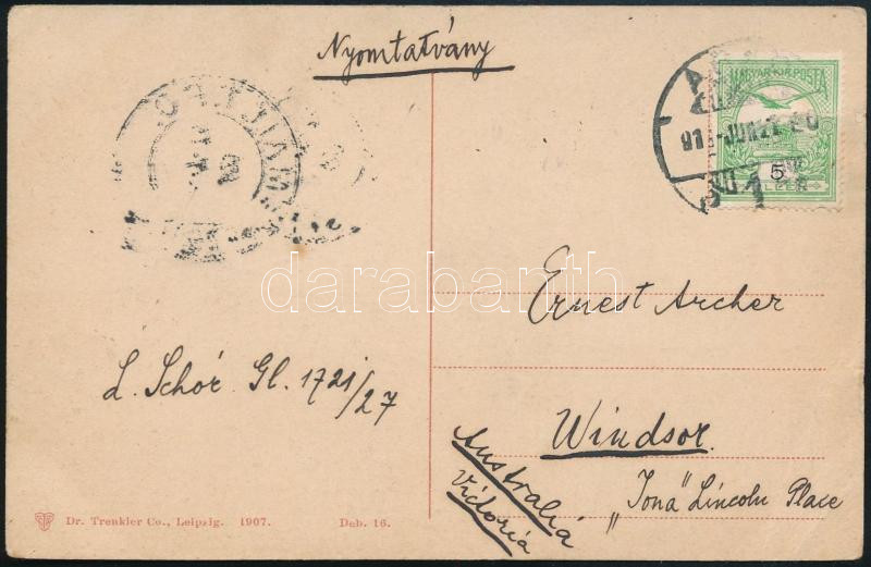 Beschreibung: 1915 Képeslap Turul 5f bérmentesítéssel Ausztráliába küldve, átmenő bélyegzéssel / Postcard to Australia