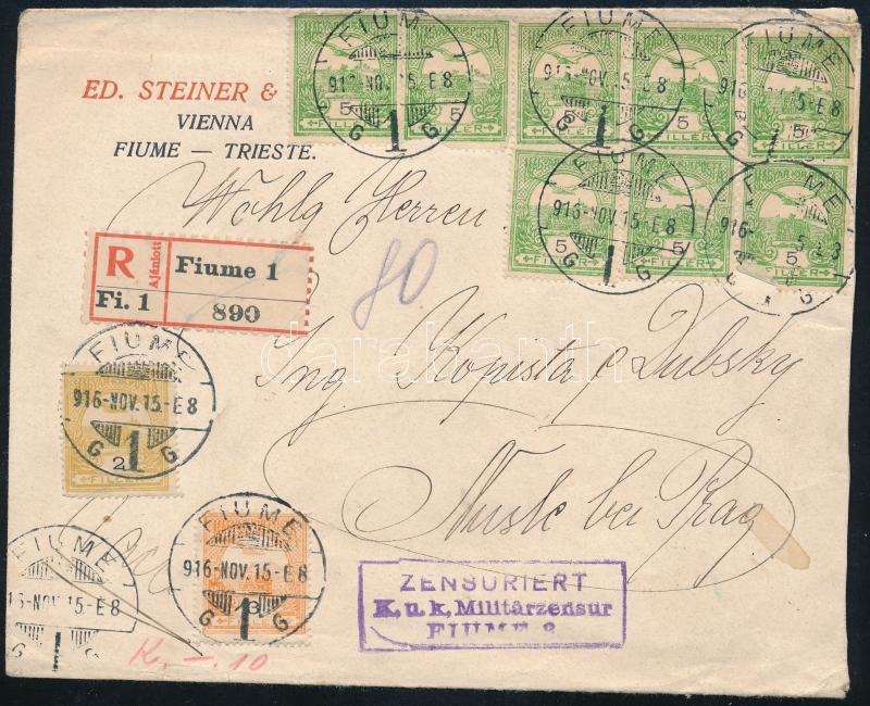 Beschreibung: 1916 Ajánlott cenzúrázott levél 10 db bélyeggel Prágába / Censored registered cover "FIUME" - Prague
