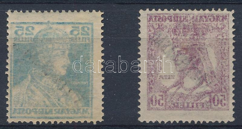 Beschreibung: 1918 Köztársaság Károly-Zita 25f + 50f gépszínátnyomattal (25f halvány gumihibák) / Mi 239 + 241 with machine offset (Mi 239 light gum disturbances)