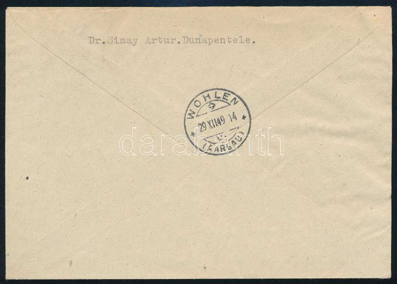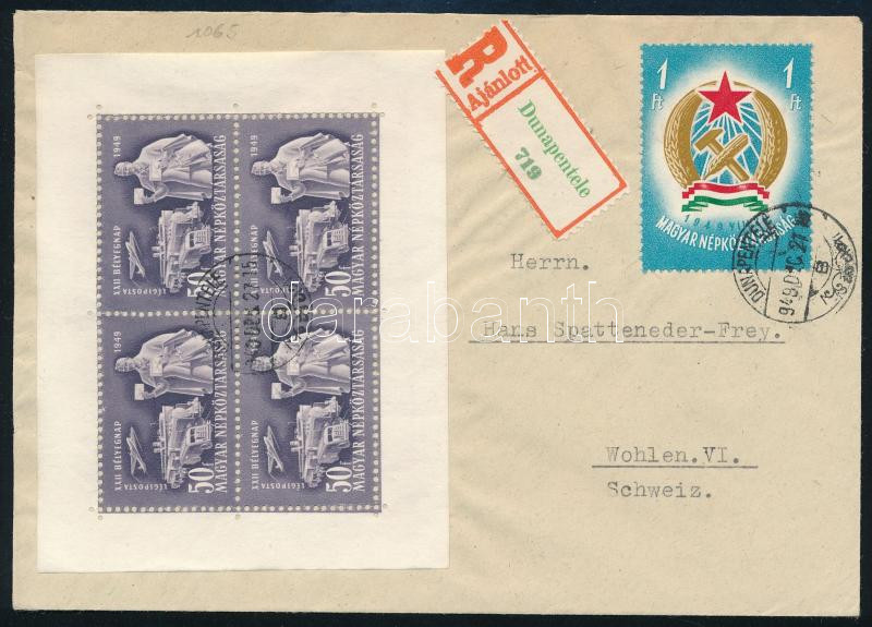 1949 Bélyegnap kisív ajánlott levélen Svájcba / Mi 1065 mini sheet on ... https://www.darabanth.com/de/45-Gross-Auktion/45.1/Philatelie-und-Postgesichte-Ungarn-Online/Ausgaben-1946-1956~18884/1949-Belyegnap-kisiv-ajanlott-levelen-Svajcba-Mi-1065-mini-sheet-on-registered-cover~II3422660