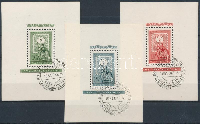Beschreibung: 1951 80 éves a magyar bélyeg blokksor korabeli elsőnapi bélyegzéssel / Mi 20-22 block set