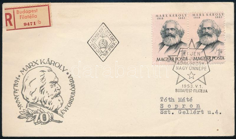 1953 Marx pár ajánlott FDC-n / Mi 1305 pair on registered FDC https://www.darabanth.com/de/45-Gross-Auktion/45.1/Philatelie-und-Postgesichte-Ungarn-Online/Ausgaben-1946-1956~18884/1953-Marx-par-ajanlott-FDC-n-Mi-1305-pair-on-registered-FDC~II3416330