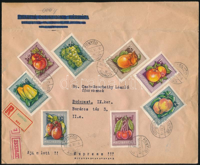 1955 Ajánlott expressz küldemény Gyümölcsök sorral "FONYÓD" ... https://www.darabanth.com/de/45-Gross-Auktion/45.1/Philatelie-und-Postgesichte-Ungarn-Online/Ausgaben-1946-1956~18884/1955-Ajanlott-expressz-kuldemeny-Gyumolcsok-sorral-FONYOD-Budapest-Mi-1387-1394-on-regi~II3416364