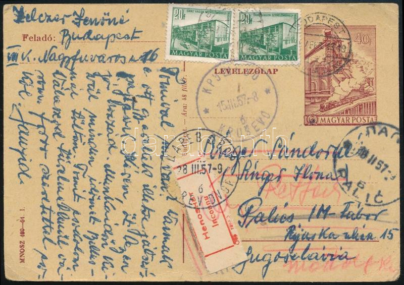 1957 Ajánlott díjjegyes levelezőlap Palicsfürdő munkatáborba, továbbküldve Macedóniába majd visszaküldve! Érdekes darab! / Registered PS-card to labor camp of Palicsfürdő, redirected to Macedonia and returned