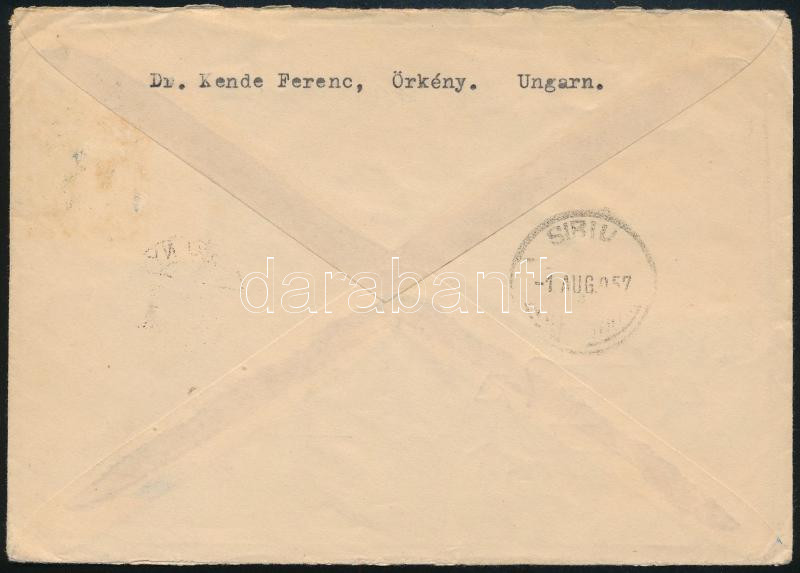 1957 Ajánlott expressz légi levél Romániába "ÖRKÉNY" / Regis... https://www.darabanth.com/de/45-Gross-Auktion/45.1/Philatelie-und-Postgesichte-Ungarn-Online/Ausgaben-1946-1956~18884/1957-Ajanlott-expressz-legi-level-Romaniaba-ORKENY-Registered-airmail-express-cover-to-Si~II3439563