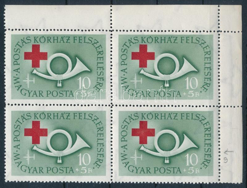 1957 Postáskórház 10+5Ft négyestömb az ismert lemezhibával / Mi 1495 c... https://www.darabanth.com/de/45-Gross-Auktion/45.1/Philatelie-und-Postgesichte-Ungarn-Online/Ausgaben-1957-1969~18886/1957-Postaskorhaz-10plus5Ft-negyestomb-az-ismert-lemezhibaval-Mi-1495-corner-block-of-4-with-pl~II3241818