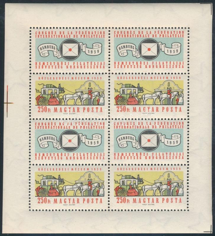 Beschreibung: 1959 FIP II. kisív "folt a nő hajában" lemezhibával / Mi 1583 minisheet with plate variety