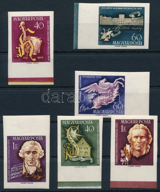 1959 Haydn és Schiller ívszéli vágott sor / Mi 1618-1623 imperforate m... https://www.darabanth.com/de/45-Gross-Auktion/45.1/Philatelie-und-Postgesichte-Ungarn-Online/Ausgaben-1957-1969~18886/1959-Haydn-es-Schiller-ivszeli-vagott-sor-Mi-1618-1623-imperforate-margin-set~II3416067