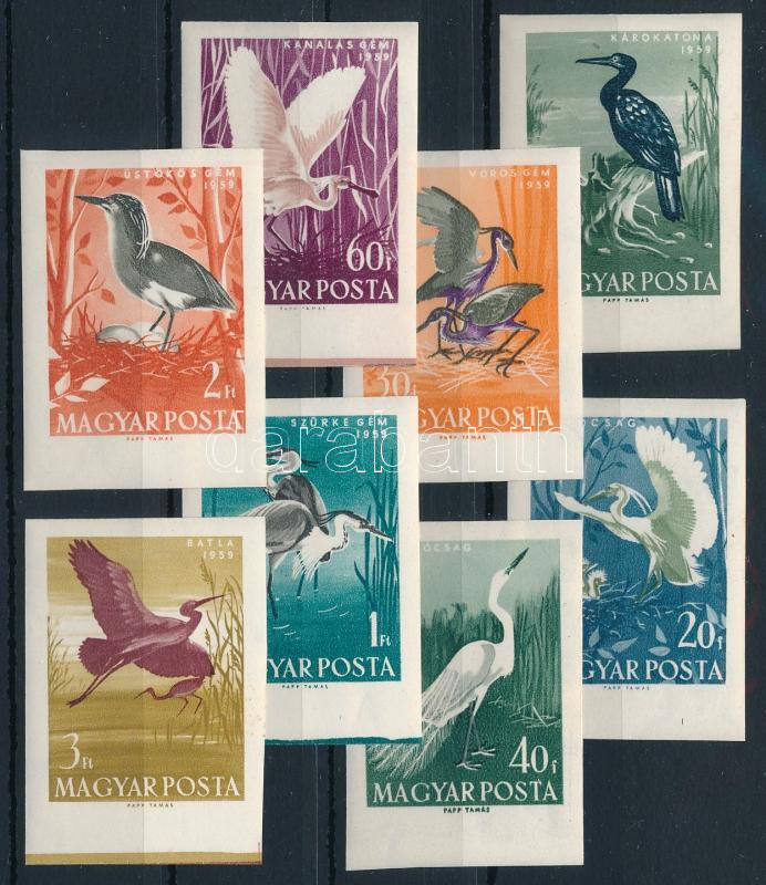 1959 Madarak vágott ívszéli sor / Mi 1593-1600 imperforate margin set https://www.darabanth.com/de/45-Gross-Auktion/45.1/Philatelie-und-Postgesichte-Ungarn-Online/Ausgaben-1957-1969~18886/1959-Madarak-vagott-ivszeli-sor-Mi-1593-1600-imperforate-margin-set~II3416097