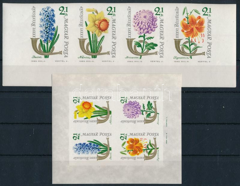 Beschreibung: 1963 Bélyegnap vágott alsó ívsarki csík (ráncok) + blokk / Mi 1967-1970 + 39 imperforate stripe (creases) and block
