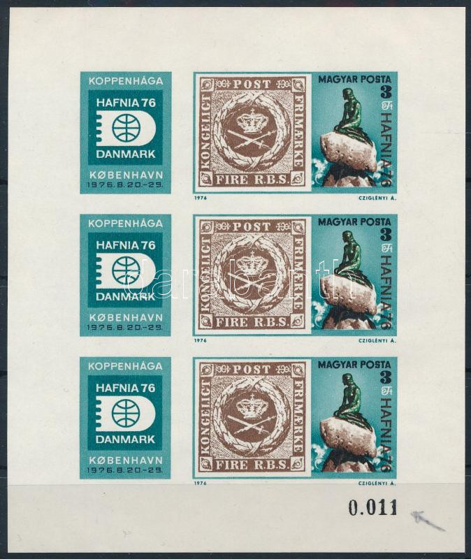 1976 HAFNIA vágott kisív / Mi 3133 imperforate mini sheet https://www.darabanth.com/de/45-Gross-Auktion/45.1/Philatelie-und-Postgesichte-Ungarn-Online/Ausgaben-1970-1979~18887/1976-HAFNIA-vagott-kisiv-Mi-3133-imperforate-mini-sheet~II3416034