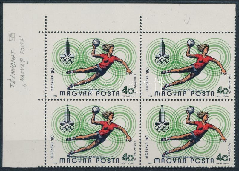 1980 Olimpia 40f ívsarki négyestömb lemezhibával / Mi 3433 block of 4 ... https://www.darabanth.com/de/45-Gross-Auktion/45.1/Philatelie-und-Postgesichte-Ungarn-Online/Ausgaben-1980-1989~18888/1980-Olimpia-40f-ivsarki-negyestomb-lemezhibaval-Mi-3433-block-of-4-with-plate-variety~II3420317