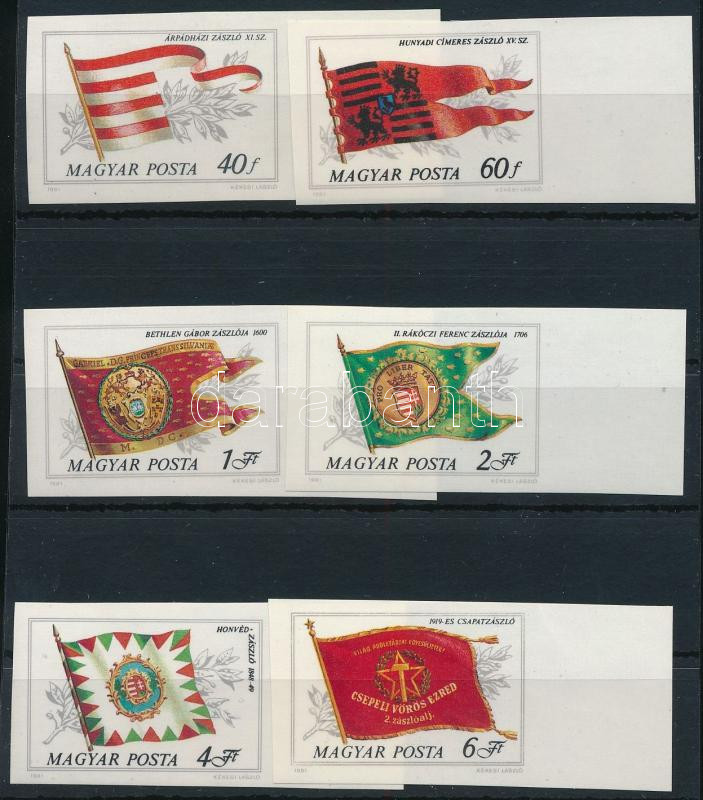 Beschreibung: 1981 Magyar történelmi zászlók ívszéli vágott sor / Mi 3486-3491 imperforated margin set