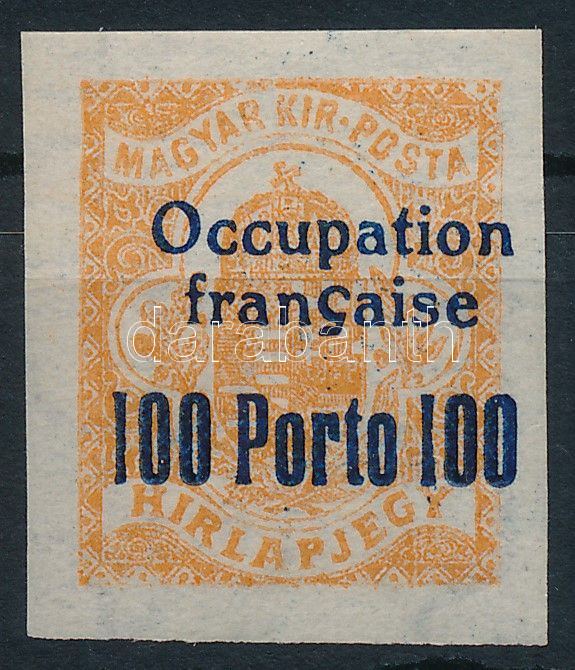 ... https://www.darabanth.com/de/45-Gross-Auktion/45.1/Philatelie-und-Postgesichte-Ungarn-Online/Besetzung-und-Lokalausgabe-1919-1921-Arad~18755/Arad-1919-Hirlap-Porto-100f-lemezhibaval-Mi-P10-with-plate-variety3Cbr-3E-Signed-Bodor~II3447864