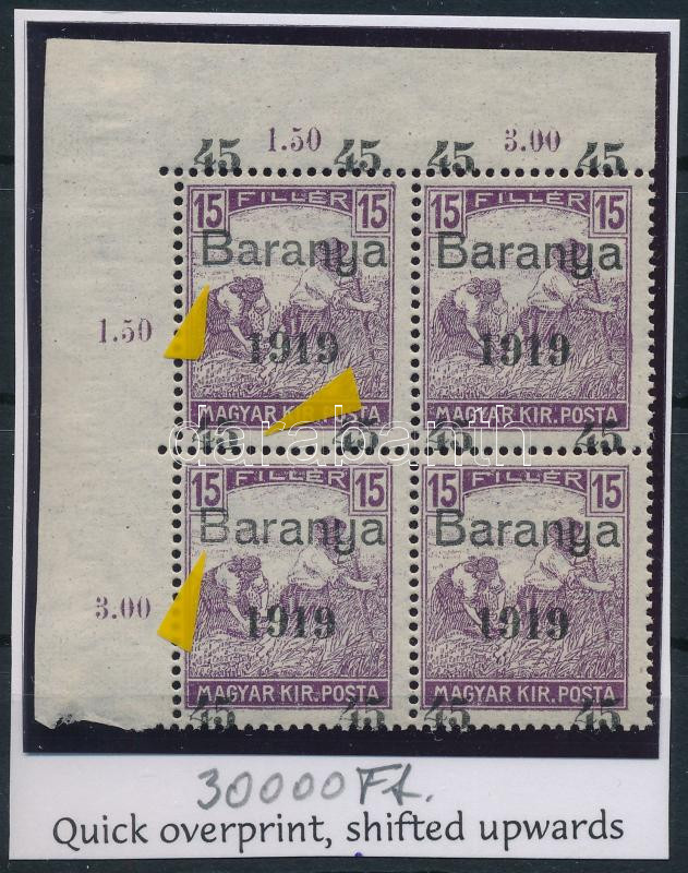 Beschreibung: Baranya I. 1919 Arató 15f négyestömb elcsúszott felülnyomattal / with shifted overprint