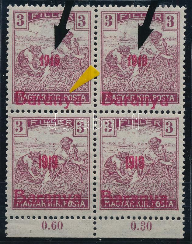 Beschreibung: Baranya I. 1919 Arató 3f négyestömb 2 bélyegen antikva számokkal / with antiqua numbers
