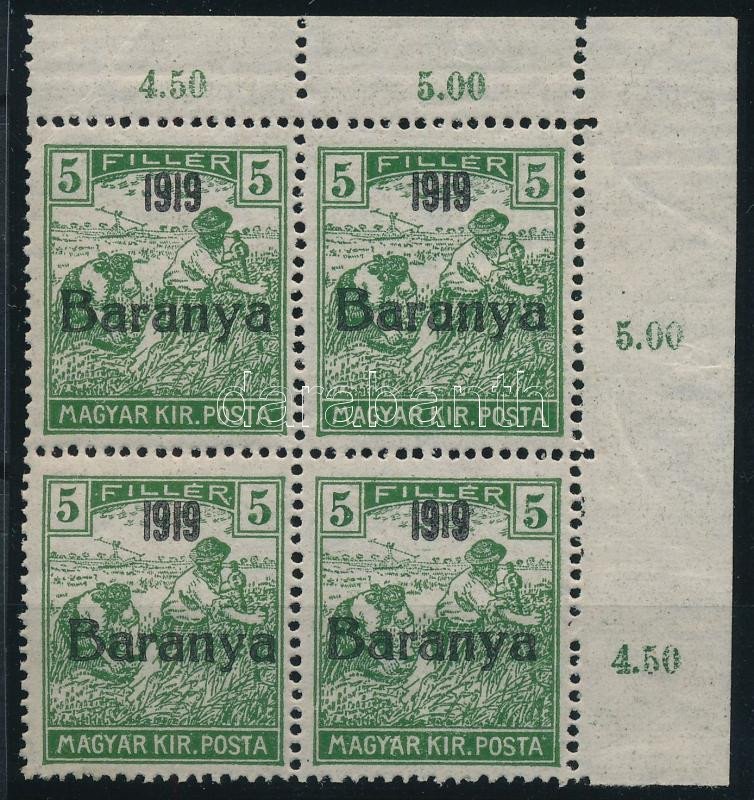 Beschreibung: Baranya I. 1919 Arató 5f négyestömb gépszínátnyomattal (halvány gumihibák) / with machine offset (light gum disturbances)