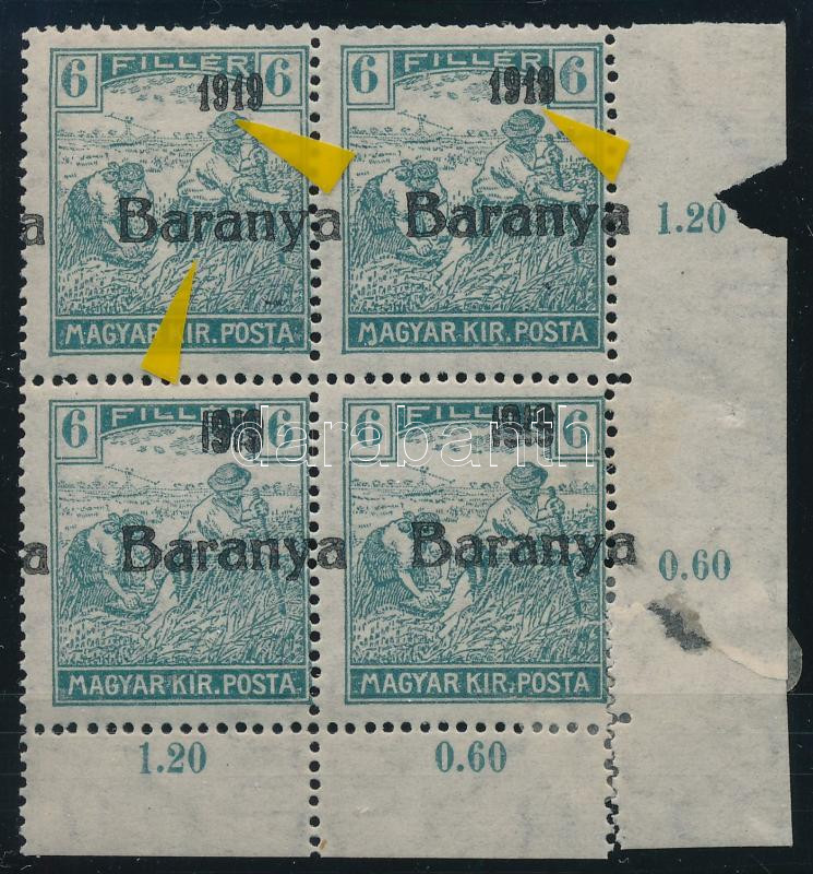 Baranya I. 1919 Arató 6f négyestömb elcsúszott felülnyomattal és 2 bélyegen antikva számokkal / with shifted overprint and antiqua numbers