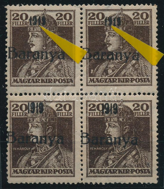Beschreibung: Baranya I. 1919 Károly 20f négyestömb 2 bélyegen antikva számokkal (törések) / block of 4 with antique numbers (folds)