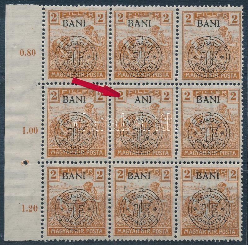 Beschreibung: Kolozsvár 1919 Arató 2f ívszéli 9-es tömb, benne ANI lemezhiba / Mi 26 I. block of 9 with plate variety
