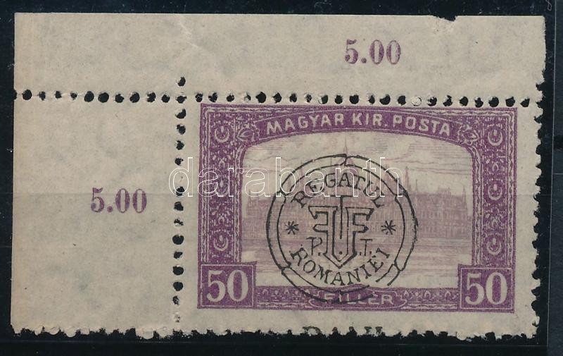 Beschreibung: Kolozsvár 1919 Parlament 50f ívsarki bélyeg, BANI nélkül / Mi 37 I. with shifted overprint