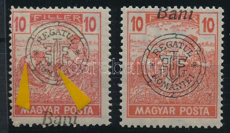 Beschreibung: Nagyvárad 1919 Arató 10f 2 db bélyeg, a "Bani" szó fent és lent, az egyik bélyeg lemezhibákkal / with plate variety