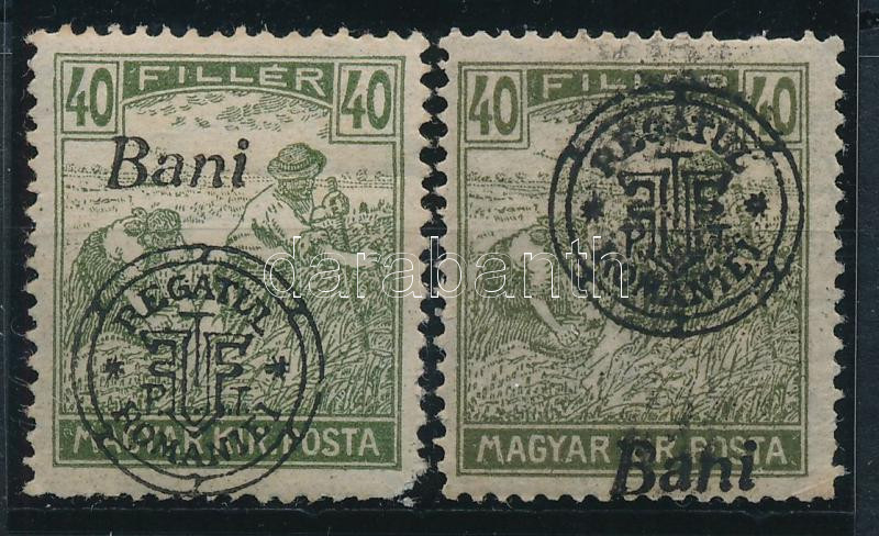 Nagyvárad 1919 Arató 40f 2 db bélyeg, a "Bani" felirat fent és lent, az egyik hátoldalra átütő felülnyomattal (törés) / with shifted perforation (fold)