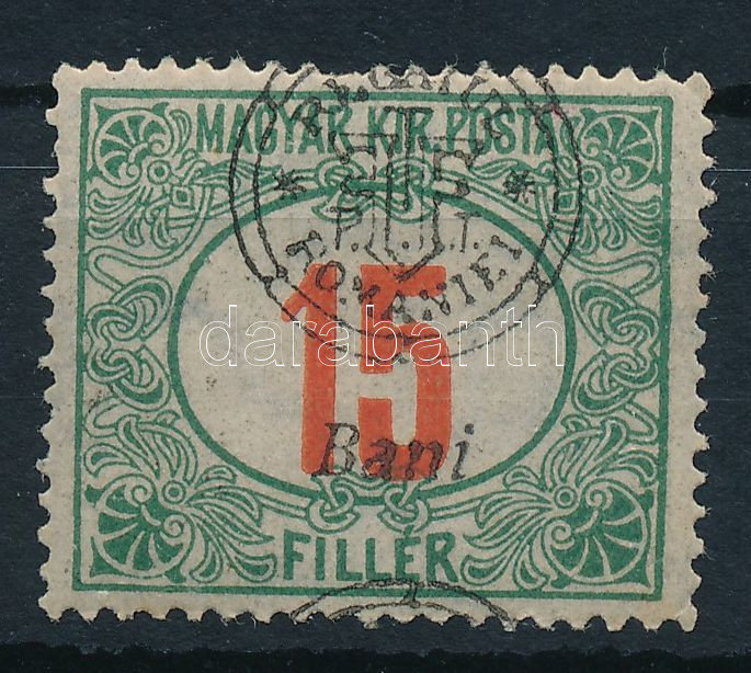 Beschreibung: Nagyvárad 1919 Portó 15f látványosan elcsúszott felülnyomással / Mi P8 II. with shifted overprint