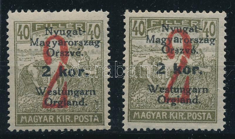 Beschreibung: Nyugat-Magyarország VI. 1921 2 db Arató 2K/40f "törött 2-es" lemezhibával