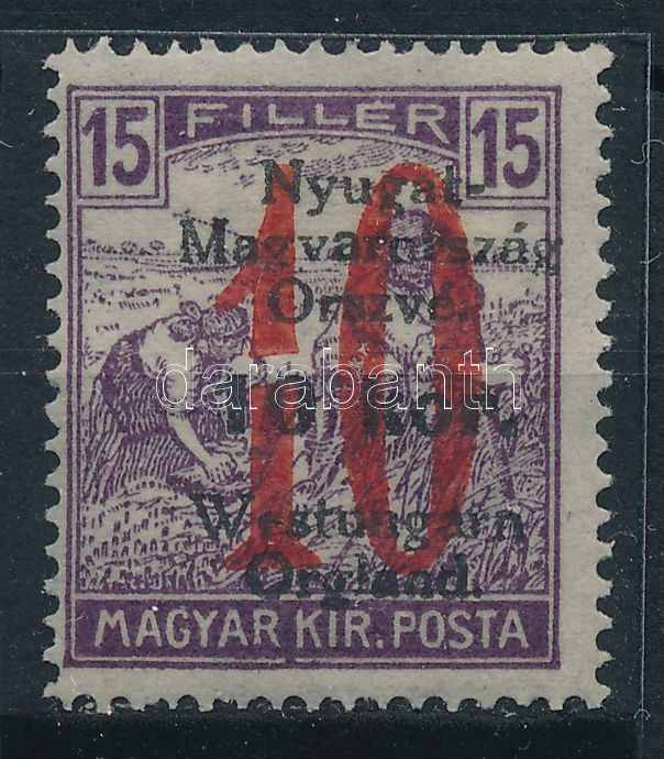 Beschreibung: Nyugat-Magyarország VI. 1921 Arató 10K/15f "törött 1-es" lemezhibával