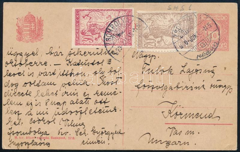 SHS 1920 10f díjjegyes magyar levelezőlap 2 db jugoszláv bélyeggel kie... https://www.darabanth.com/de/45-Gross-Auktion/45.1/Philatelie-und-Postgesichte-Ungarn-Online/Besetzung-und-Lokalausgabe-1919-1921-SHS~18861/SHS-1920-10f-dijjegyes-magyar-levelezolap-2-db-jugoszlav-belyeggel-kiegeszitve-ZSOMBOLYA-K~II3438425